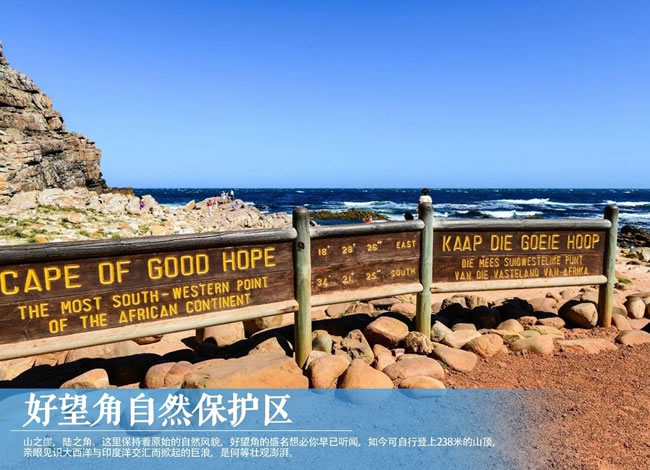 【好望角】于開普半島南端,在保護區(qū)內(nèi),鐵銹色凹凸不平的地面上生長著一片片低矮的灌木叢和被稱為南非國花的山龍眼,狒狒、非洲旋角大羚羊等動物間或在眼前一躍而過。在大西洋邊紅色的卵石灘上,時??梢婑匄B閑庭信步的可愛模樣。在保護區(qū)的西南端有一個如同伸入大西洋中巨大鱷魚爪的岬角。