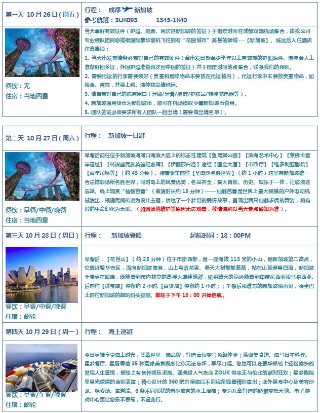 團隊成都出發(fā)時間:2018年10月26日 郵輪當?shù)貑⒑綍r間:10月28日