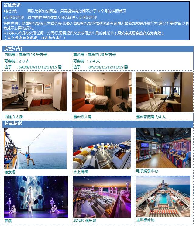 14、船上小費:星夢套房以下艙房為每人每晚21新幣;星夢套房(含)及以上房型每人每晚26新幣;2歲以下兒童免服務費;